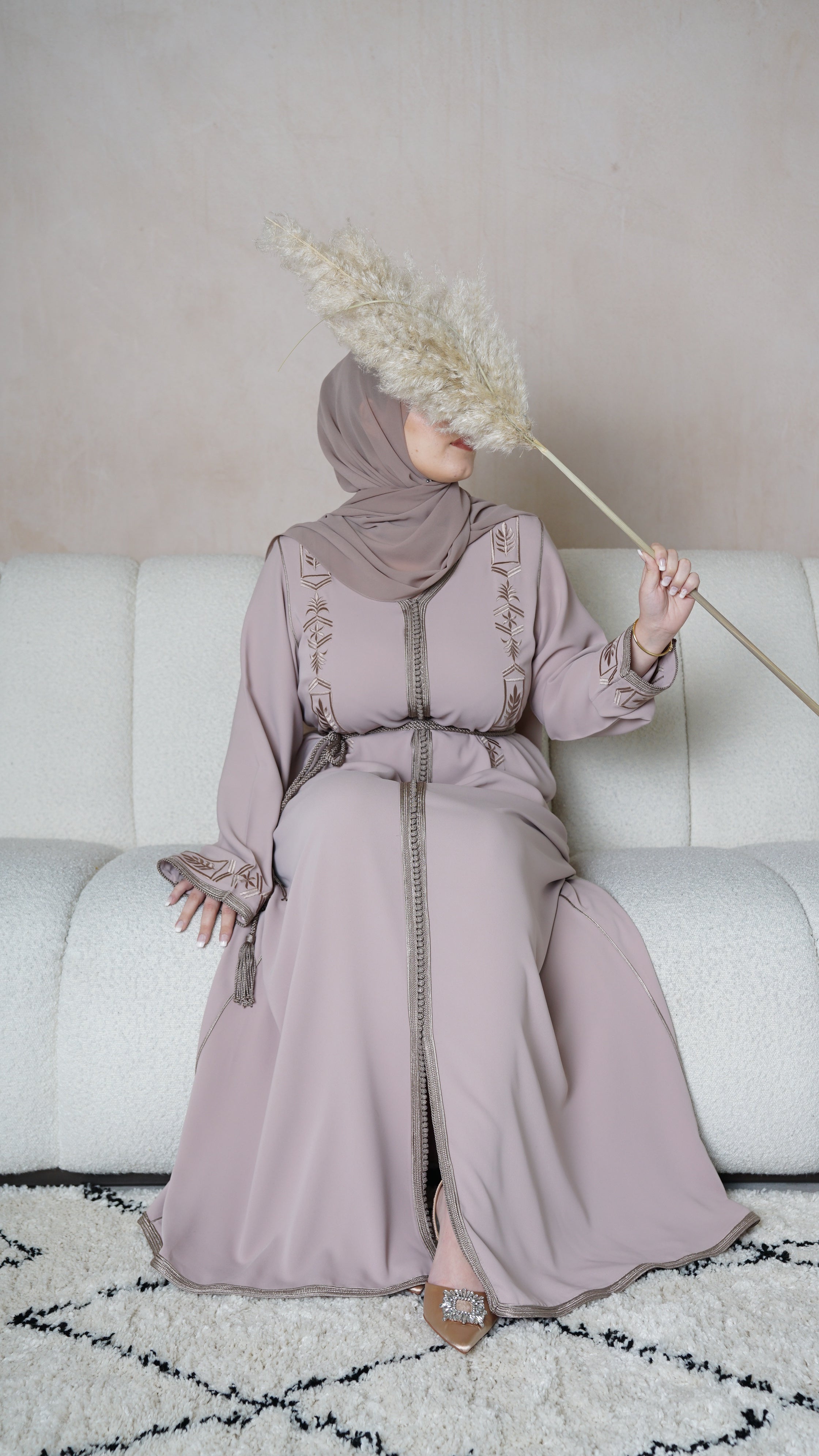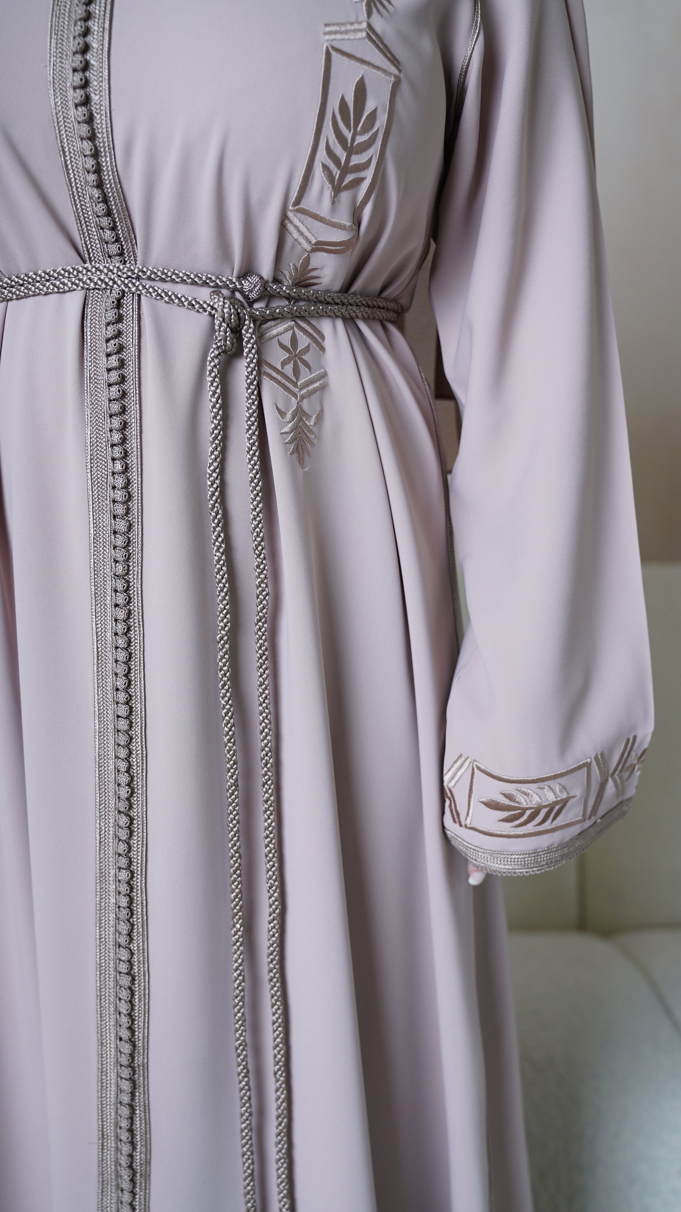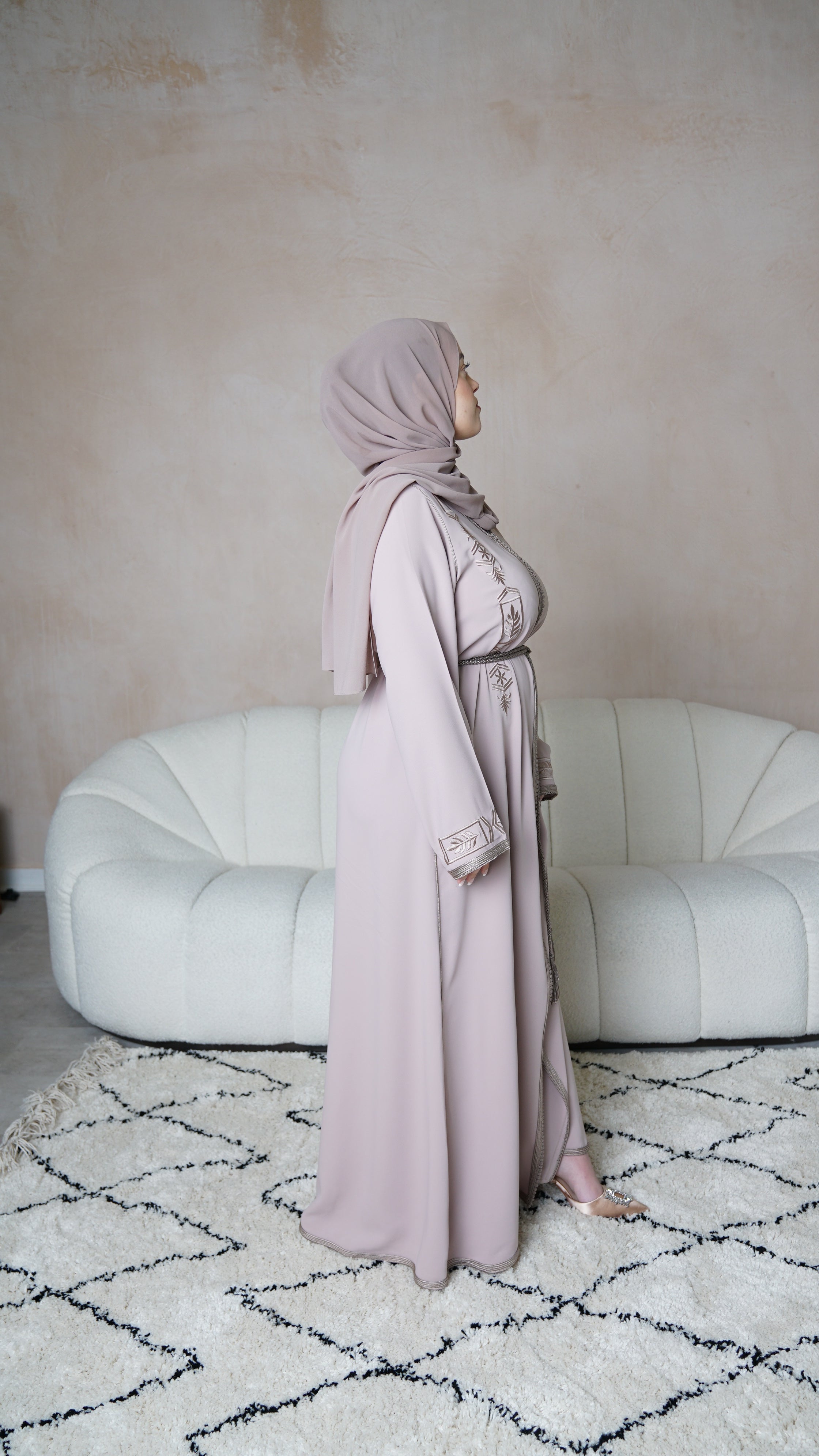 Discover the allure of "The Essentials" collection featuring our Moroccan Kaftan in glamorous Perfect Nude. The meticulously crafted kaftan boasts a simple and feminine look with its single Sfifa and luxurious crêpe material. Customize the fit with the complementary matching belt. Elevate your wardrobe with impeccable craftsmanship and luxurious materials.