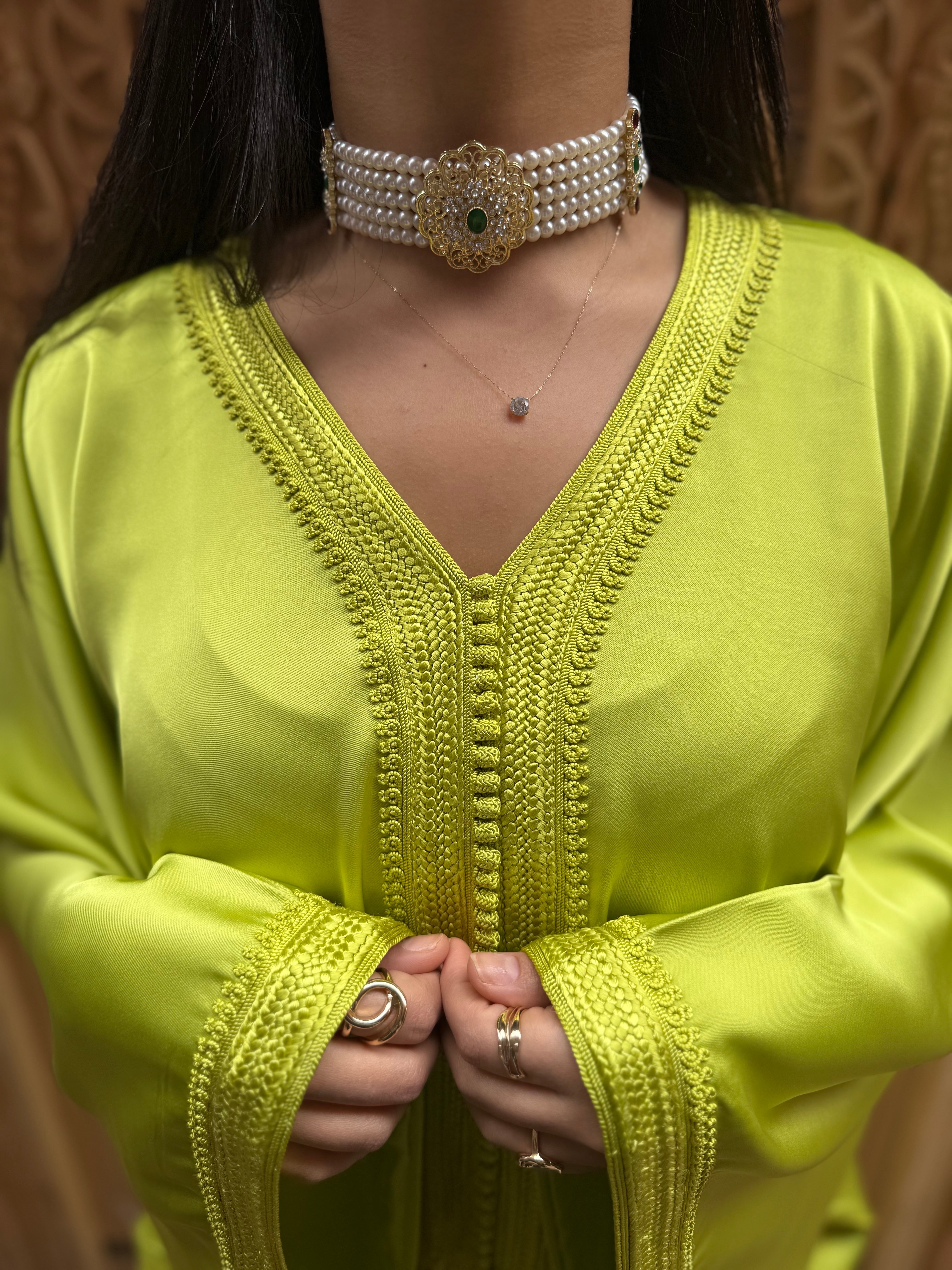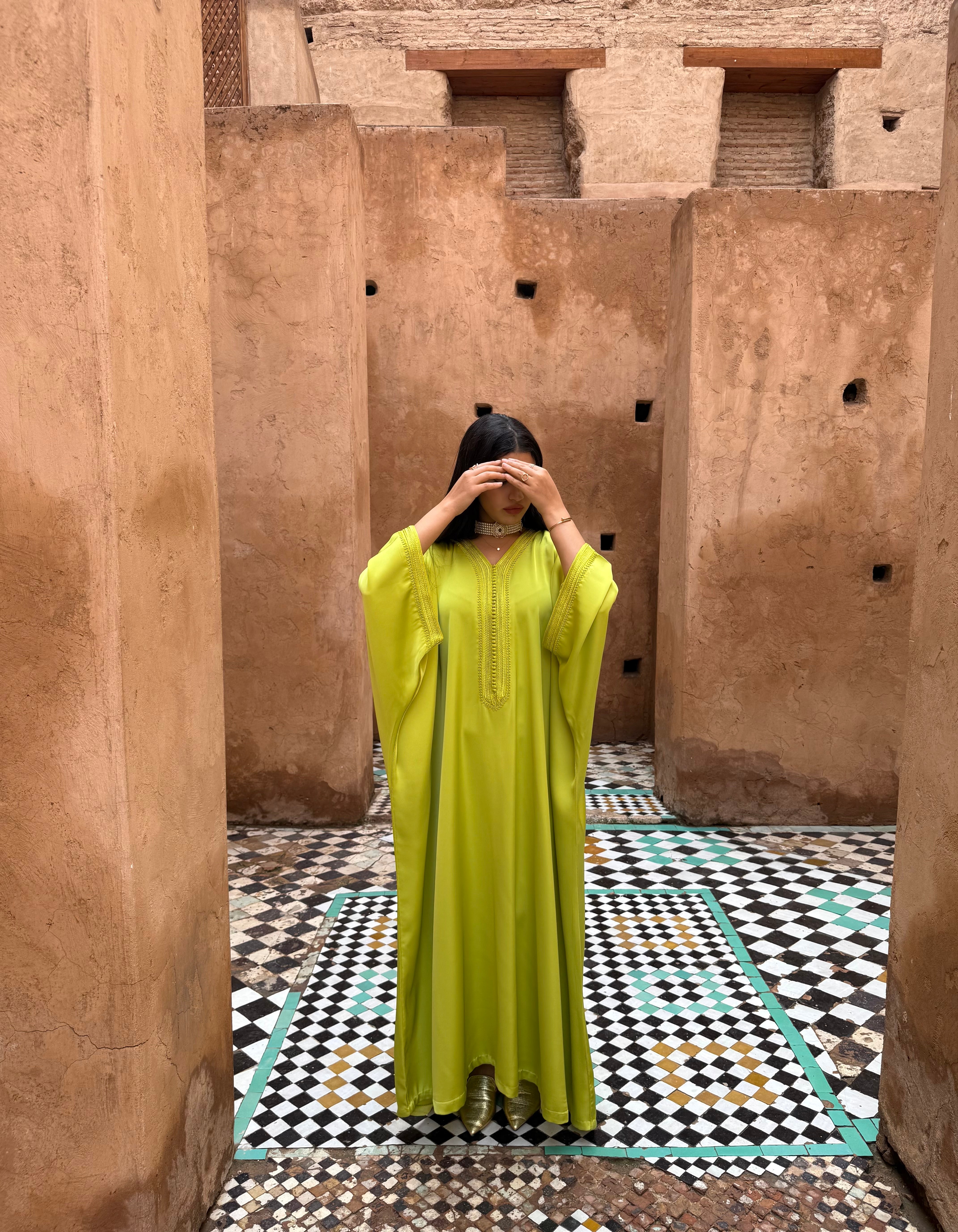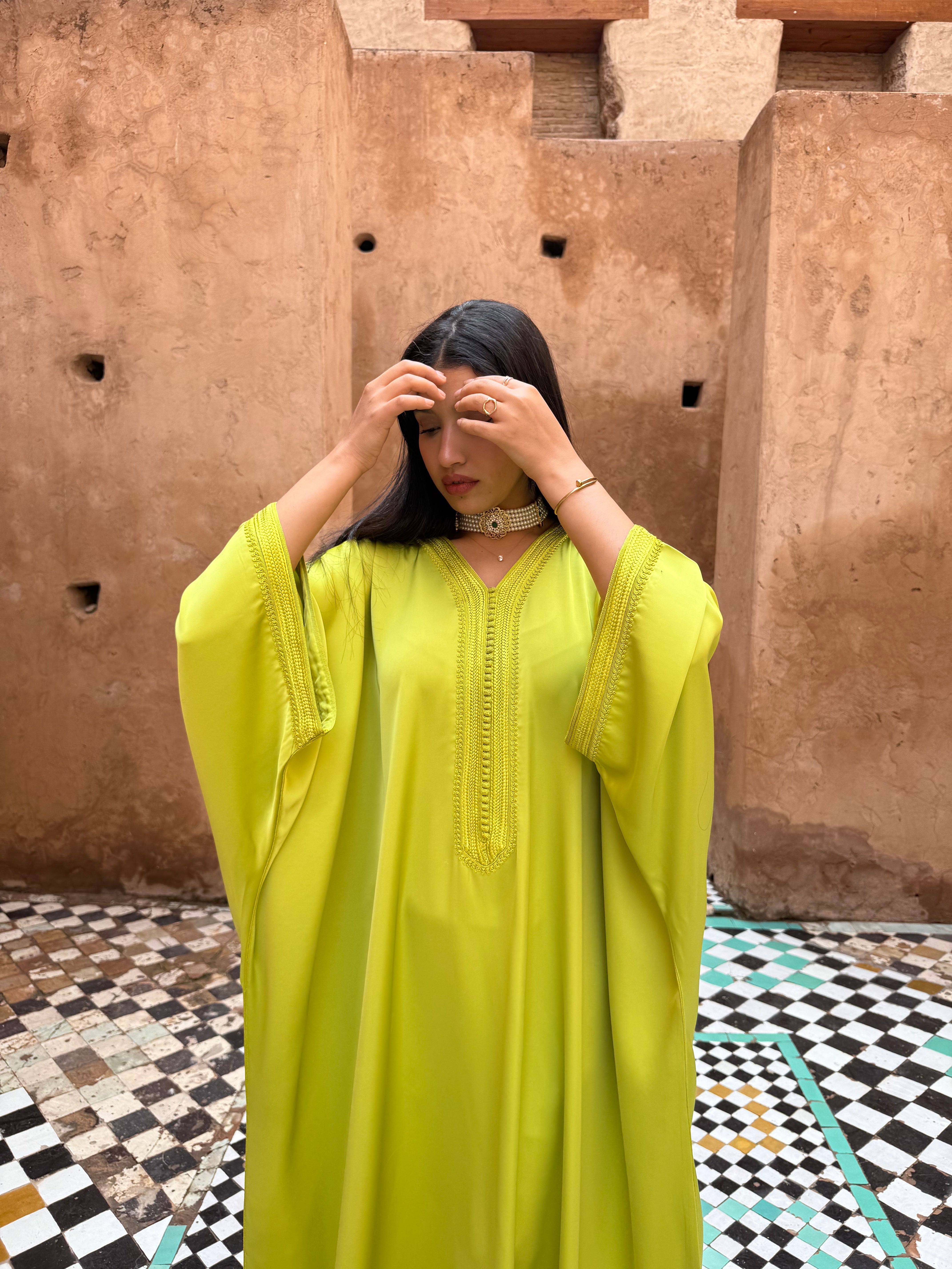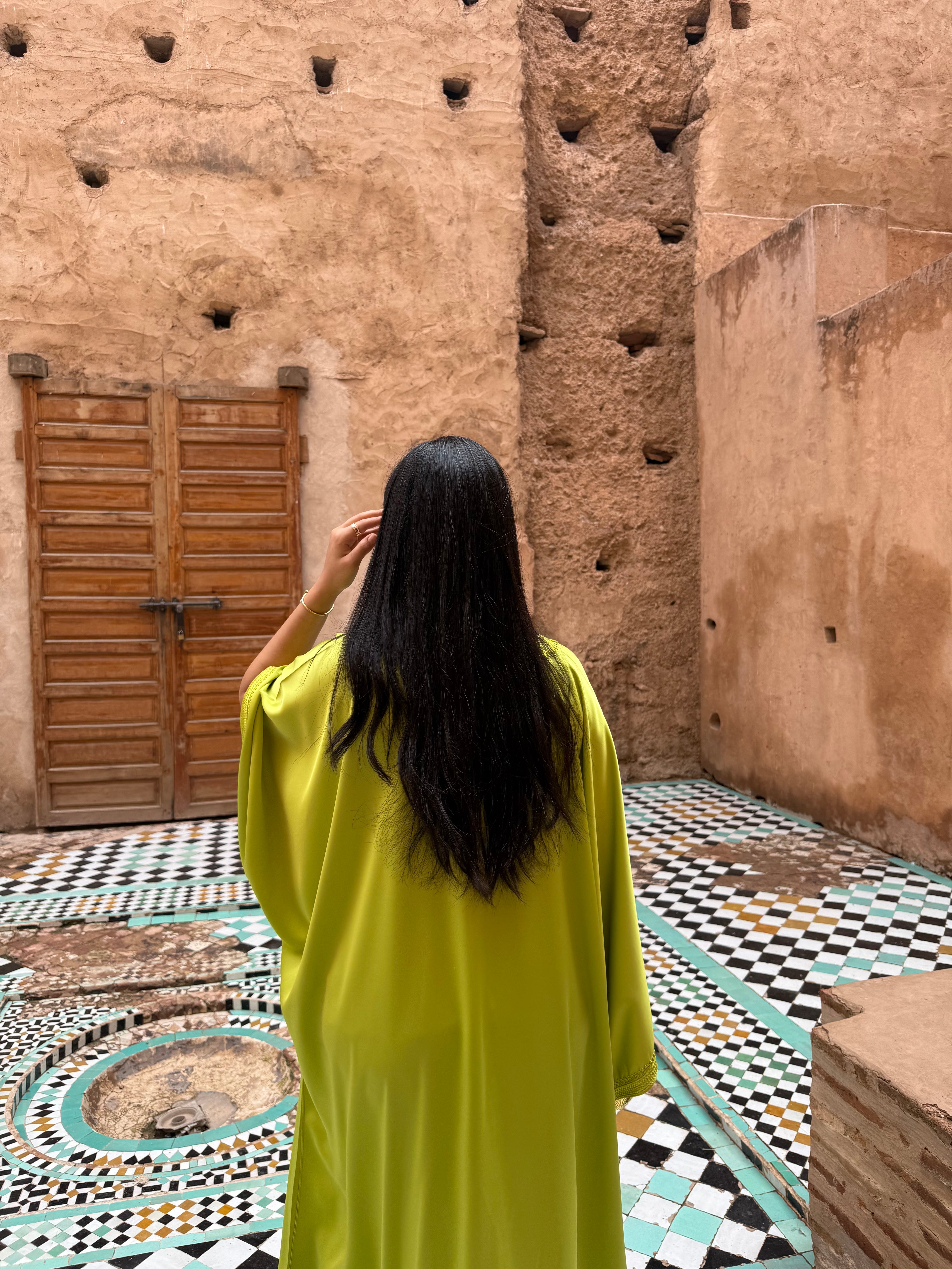 The Sultana Gandoura is crafted in a luminous lime satin that catches the light beautifully. It drapes effortlessly across the body, with wide batwing sleeves that add graceful movement and ease.